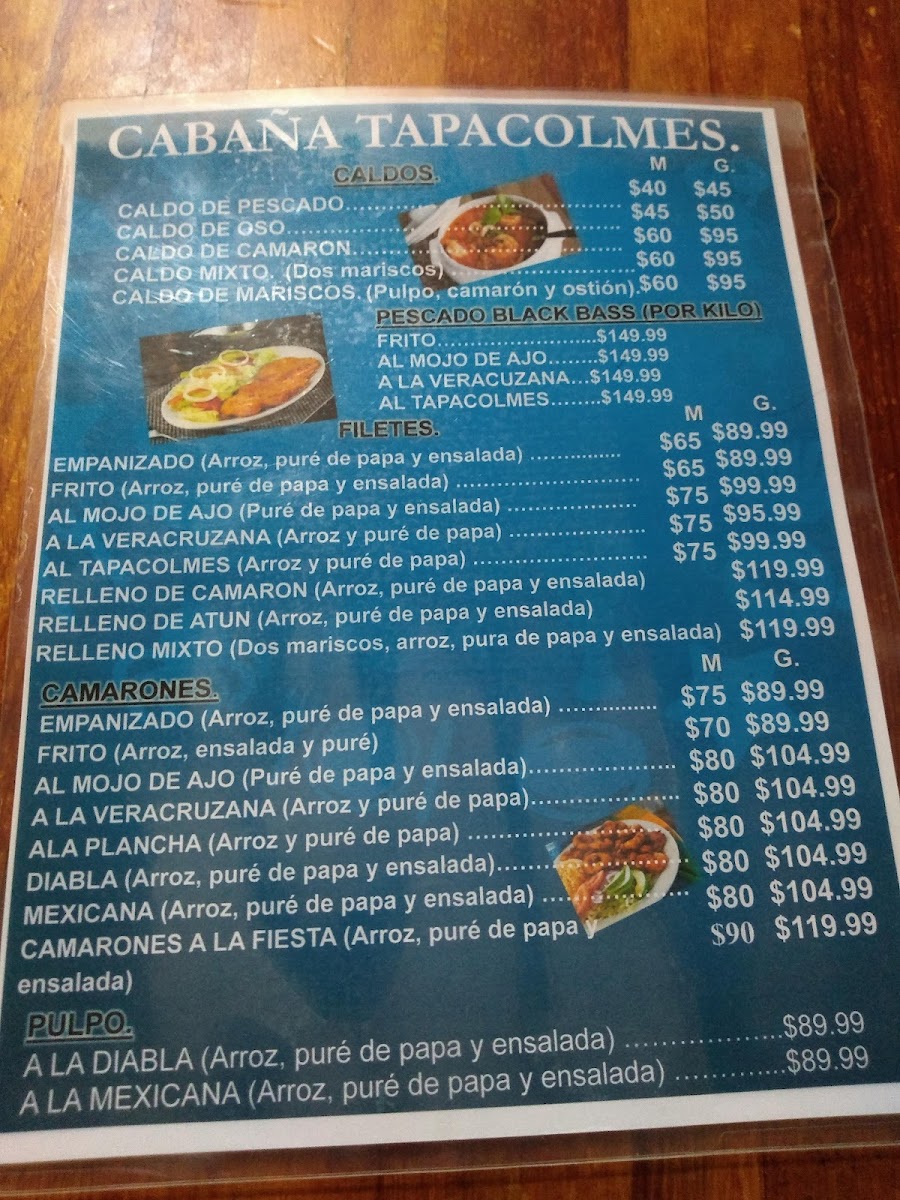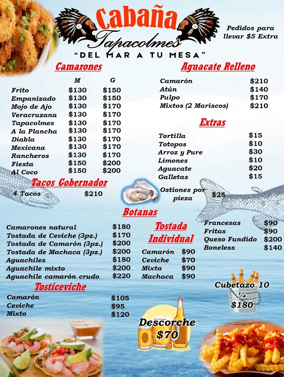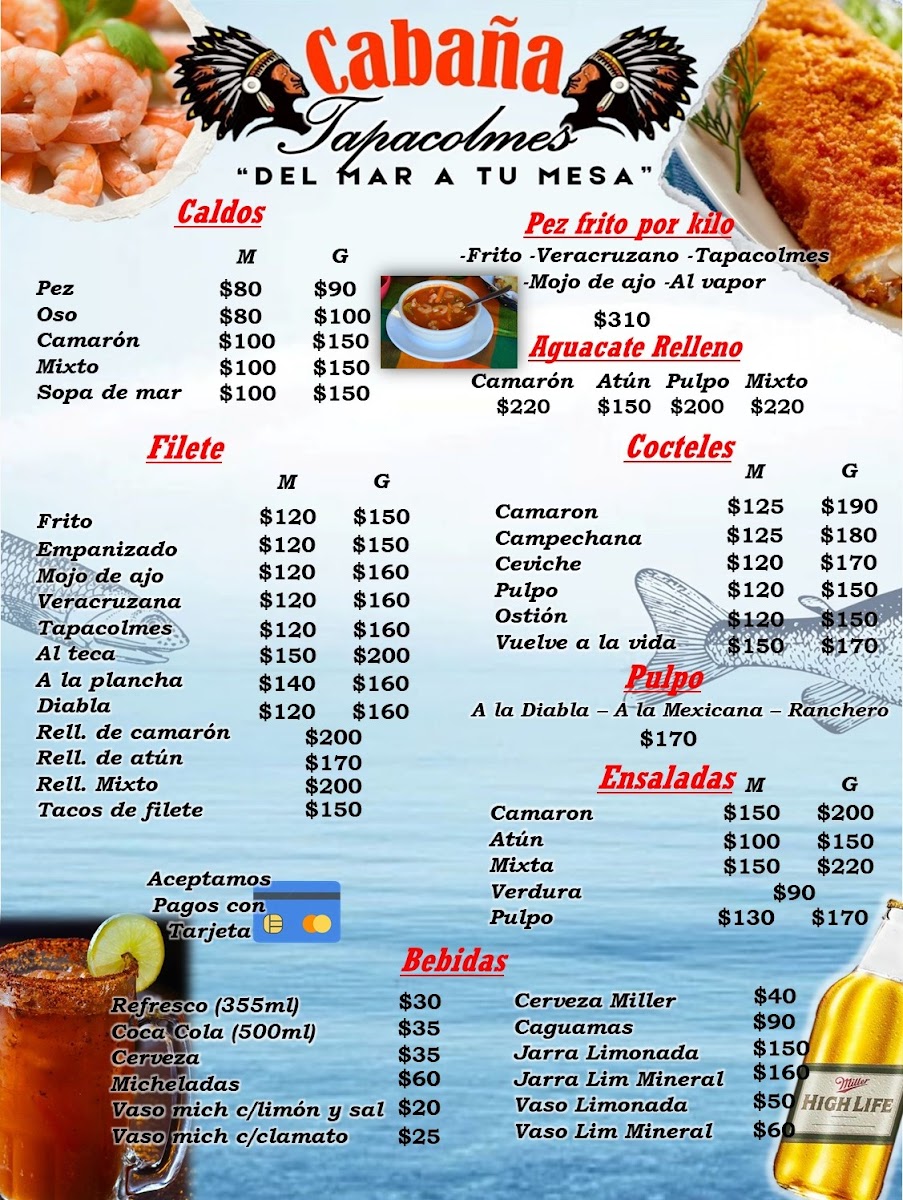 Cabaña Tapacolmes offers a diverse and flavorful menu that reflects the best of traditional Mexican cuisine with a focus on fresh, local ingredients. The highlight of the menu includes their signature soups, such as the hearty Caldo de Oso and the refreshing Caldo de Camarón, both of which bring rich, savory flavors that are perfect for any occasion. For those craving something with a bit more spice, the Aguachiles is a must-try, offering a zesty and tangy kick. Accompanying these dishes is the refreshing Limonada Natura, a perfect balance of sweetness and tartness, ideal for complementing the rich flavors of the meal. For a more substantial main course, the Filete Relleno de Atún stands out with its tender, stuffed tuna fillet, while the Filete A la Veracruzana offers a classic, savory fish option prepared with traditional Veracruz sauce. The Camarones Fiesta is another crowd-pleaser, with its perfectly cooked shrimp offering a delicious, festive experience. To elevate the meal, a variety of Salsas Y Aderezos are available, adding unique flavors to every dish. Whether you're indulging in one of the signature soups or savoring a rich entrée, the menu at Cabaña Tapacolmes guarantees a memorable dining experience with each dish expertly prepared to delight the palate.